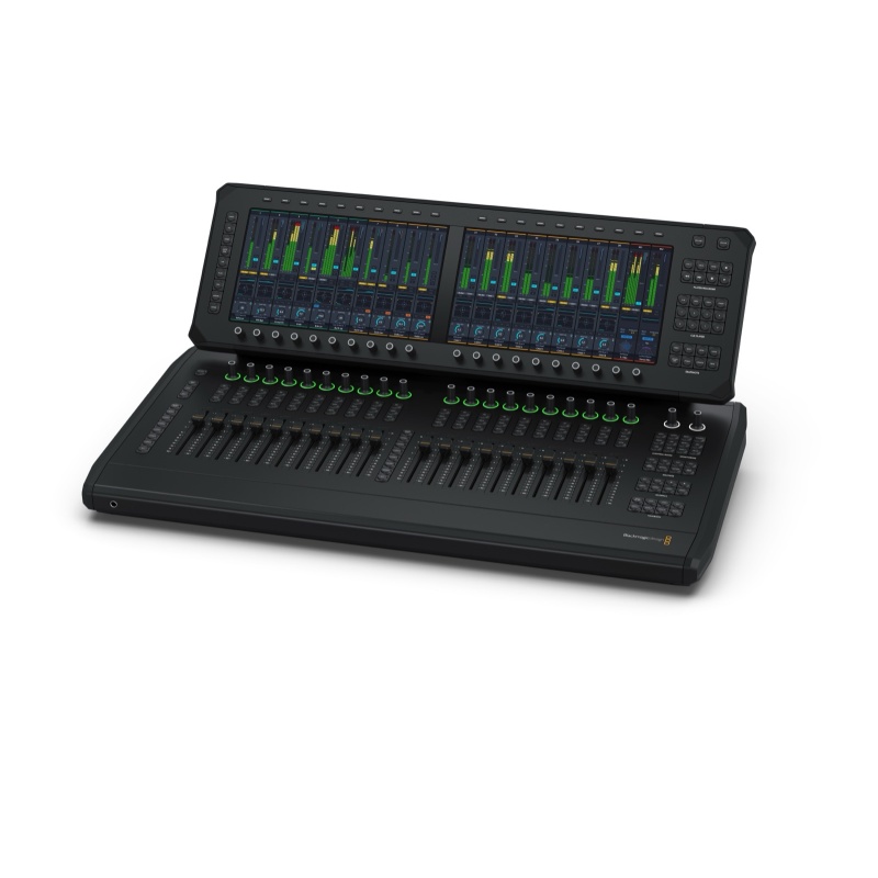 Fairlight Live Audio Panel 20 is a desktop control surface with 20 motorized faders and two large touchscreen displays, designed for professional live audio mixing with Fairlight Live. Controls include layers, bus, matrix, aux, VCA, sub-masters and talkback for fast hands-on access to your mix. The touchscreens display channel strip information, levels, EQ, dynamics processing and plug-in interfaces. Ideal for home studios and mid-sized productions. Fully integrated with Fairlight Live.